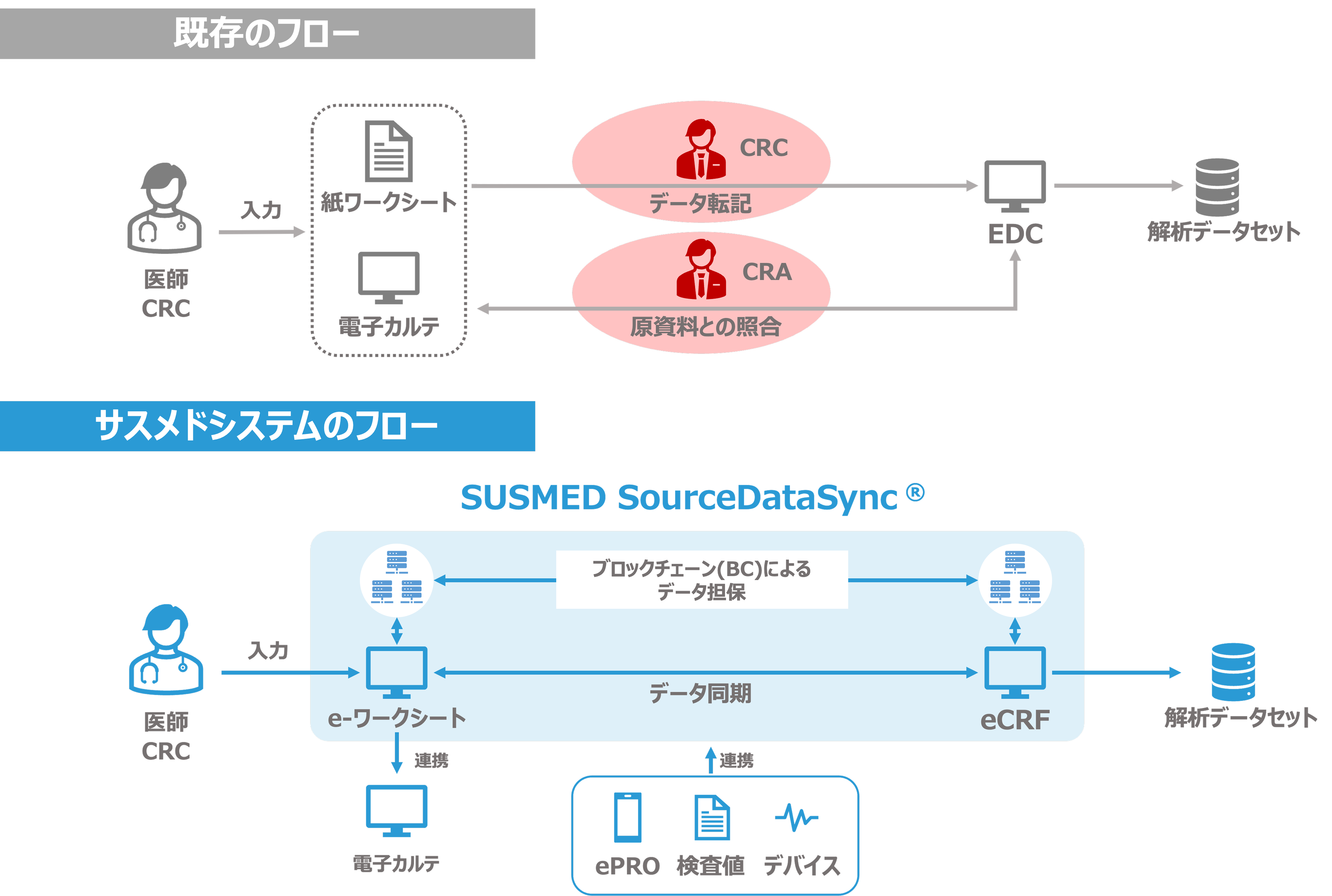 「サスメドシステム」は、臨床試験の効率化のためのデジタルソリューションの総称です。 一方で、ブロックチェーン技術を搭載したサスメドシステムを活用すれば、医療機関に出向いてデータの照合作業を行う必要がなくなります。私たちは、サスメドのモニタリングシステムが適切に運用されれば、医療機関に出向いてのデータの照合作業は不要であることを、グレーゾーン解消制度を利用して所轄省庁である厚生労働省に確認しました。