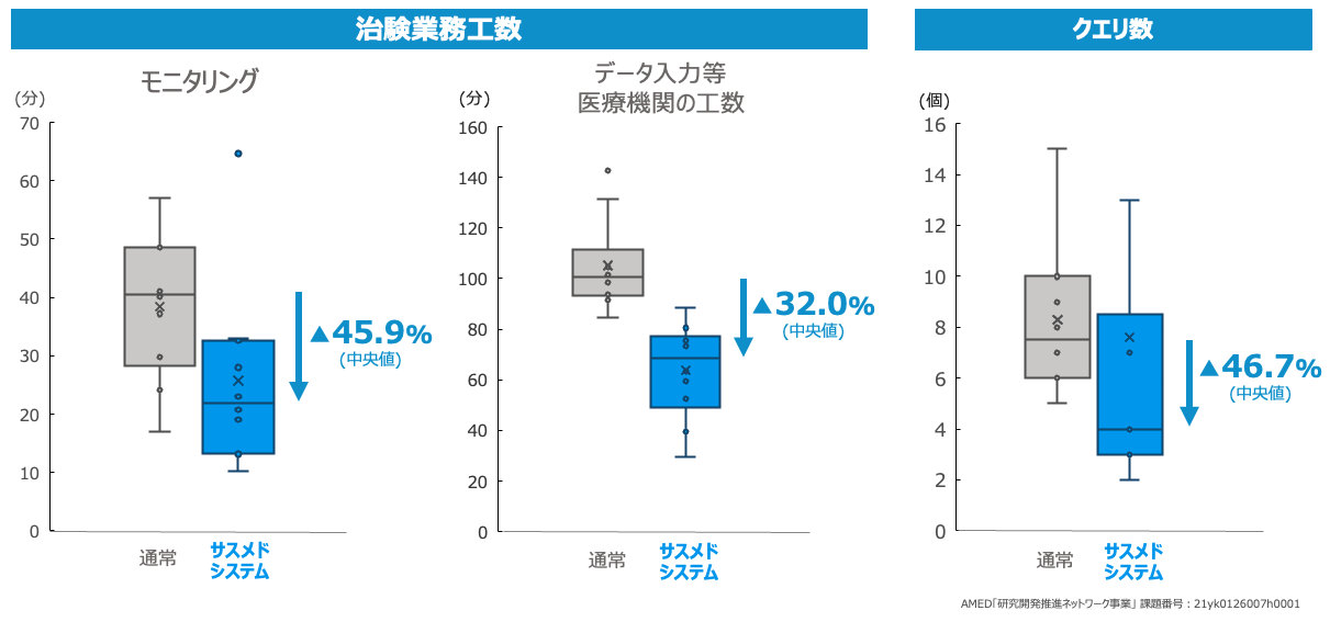 また、AMEDの「研究開発推進ネットワーク事業」において、モニタリングや医療機関のデータ入力の工数が低減されることを検証しております。